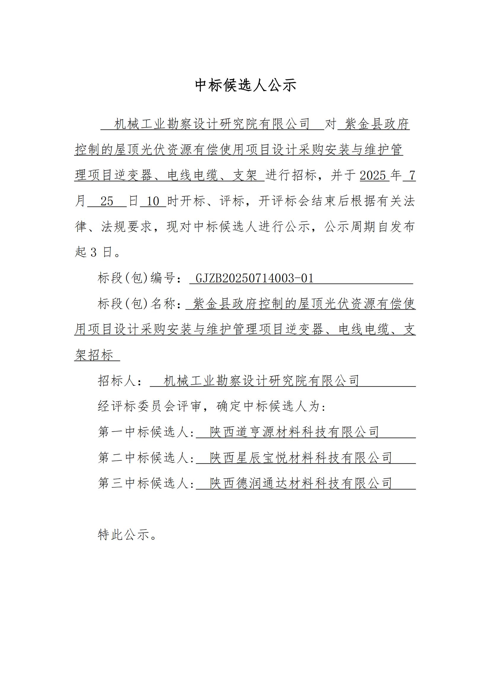 紫金縣政府控制的屋頂光伏資源有償使用項(xiàng)目設(shè)計(jì)采 購(gòu)安裝與維護(hù)管理項(xiàng)目逆變器、電線電纜、支架招標(biāo)中標(biāo)候選人公示